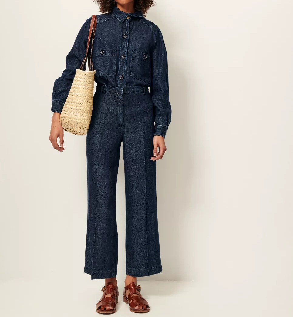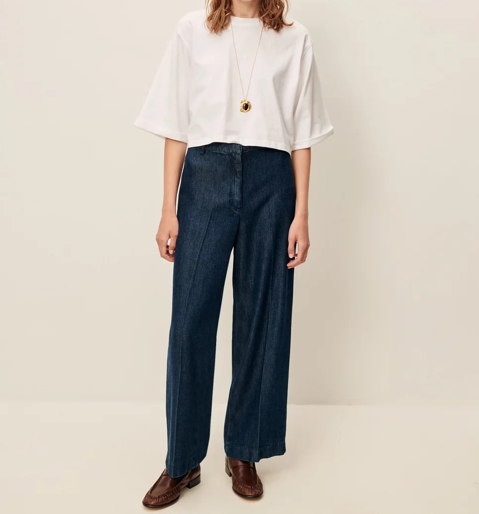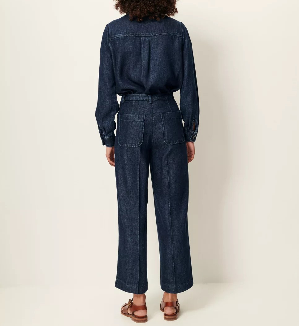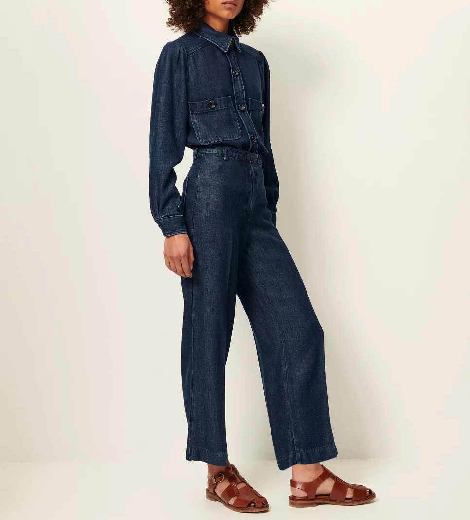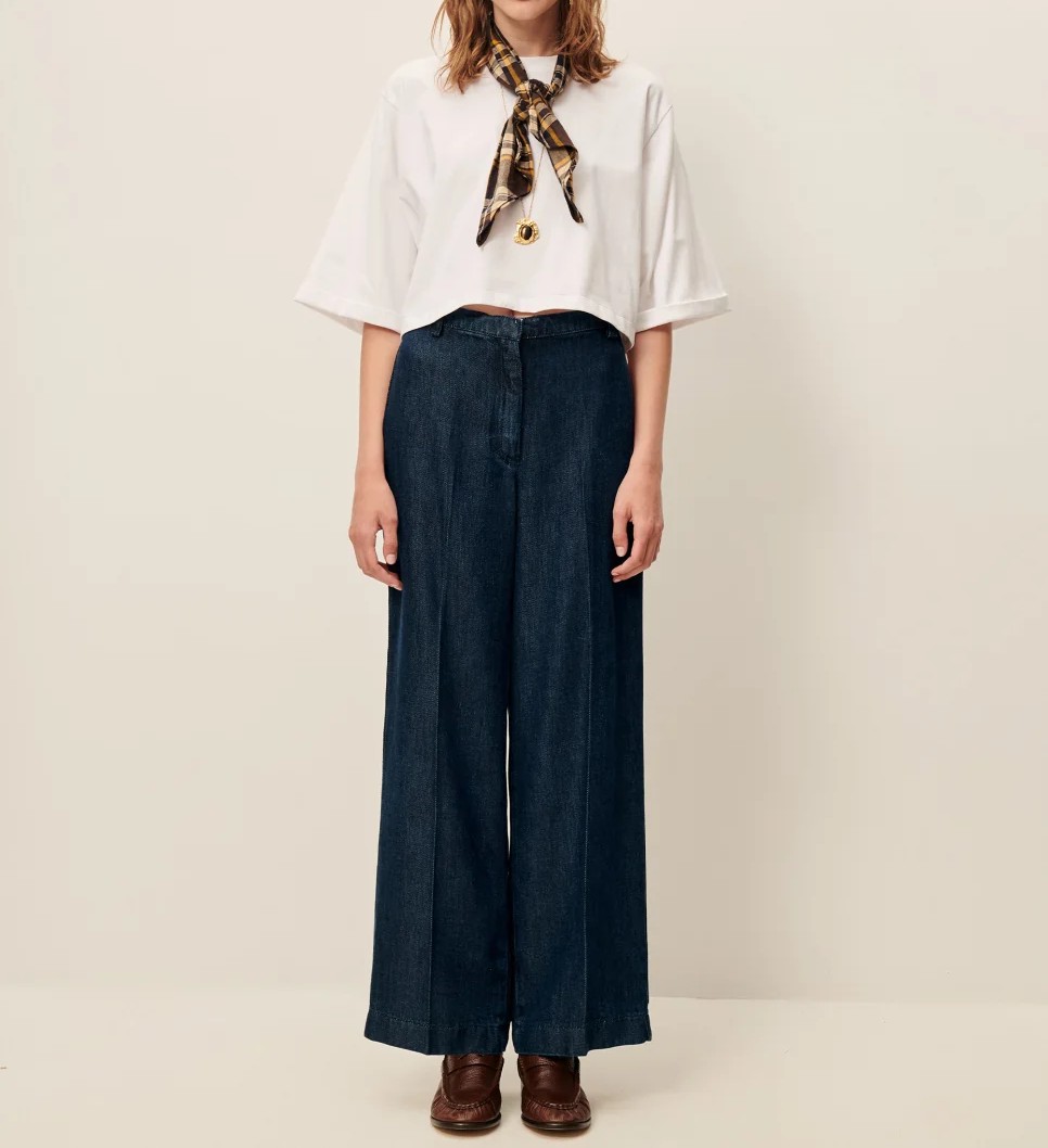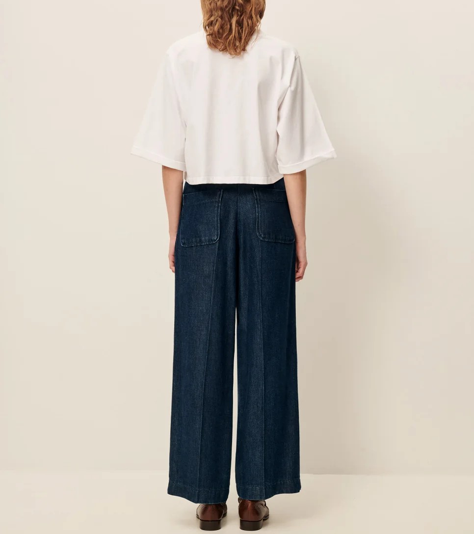 Pantalon recto en sarga gruesa y fluida de lyocell lavado, con hilos teñidos en indigo, tejido en España