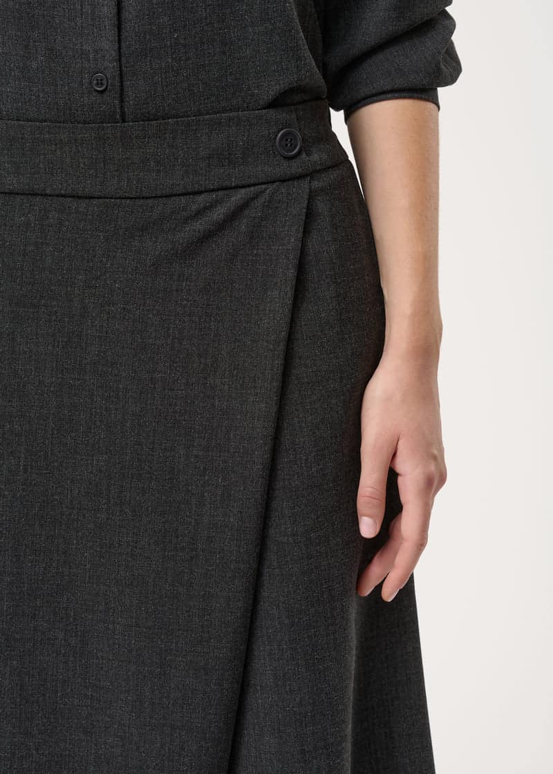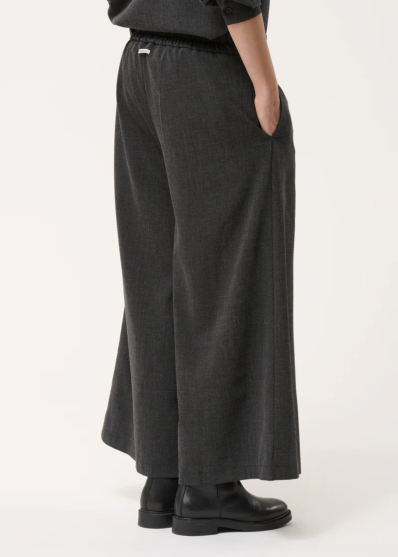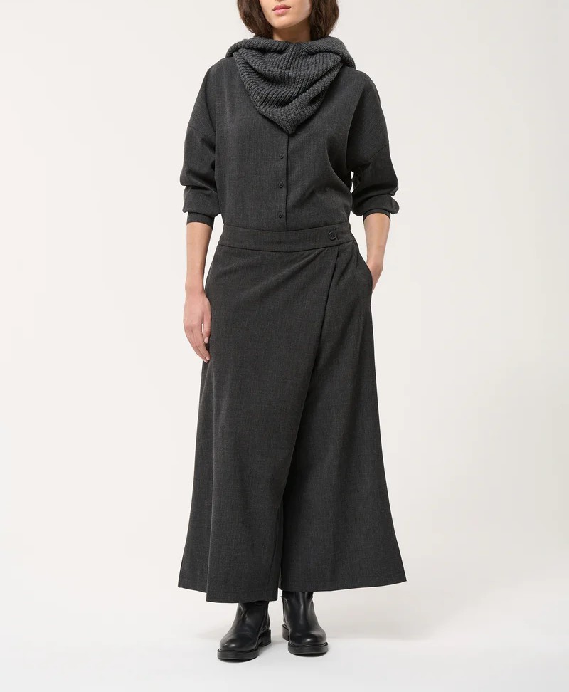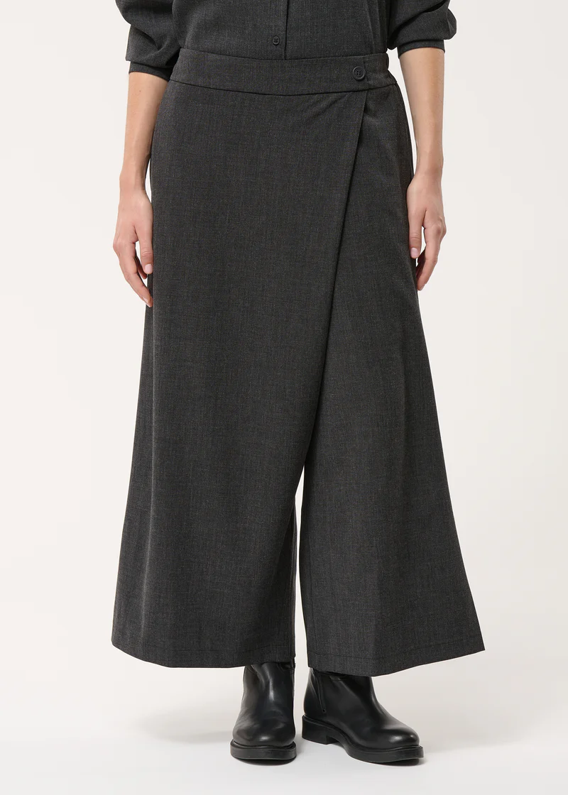 Falda pantalon asimetrica lisa, corte rollo thailandes, piernas anchas con un panel cruzado, tobillero, cintura alta y elastica en la parte de atras. Bolsillos invisibles