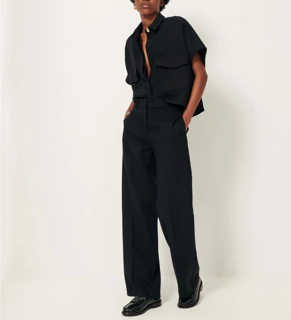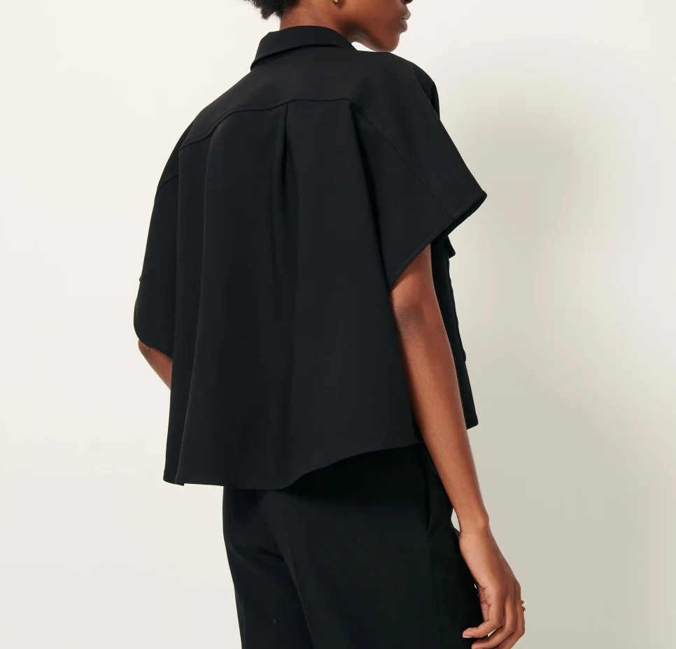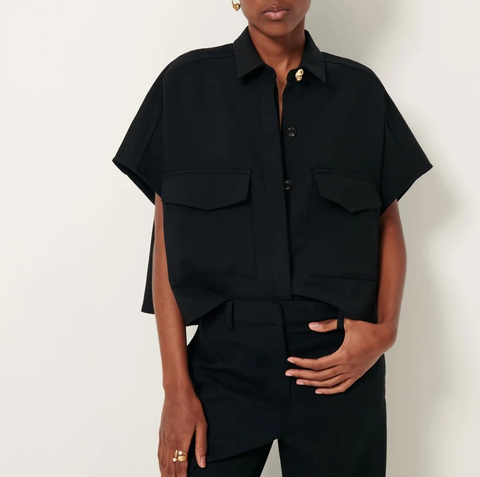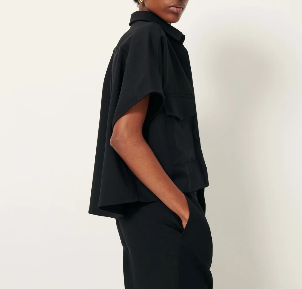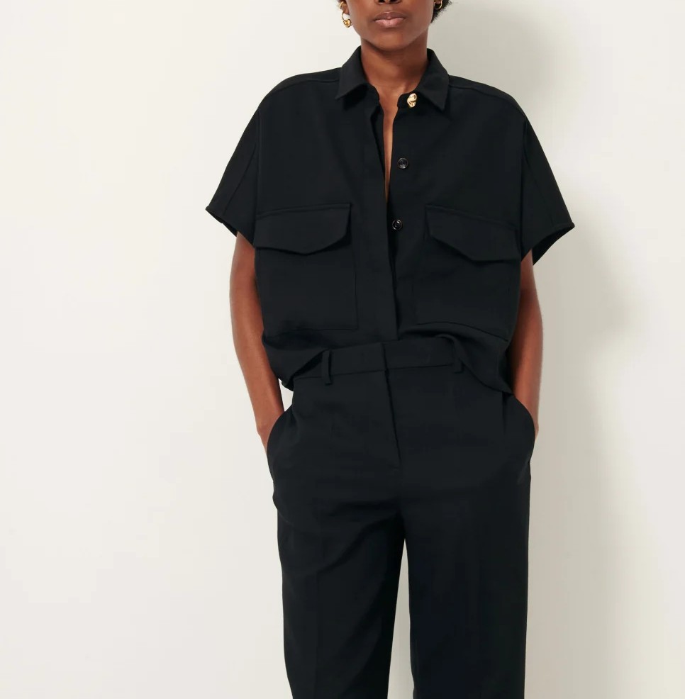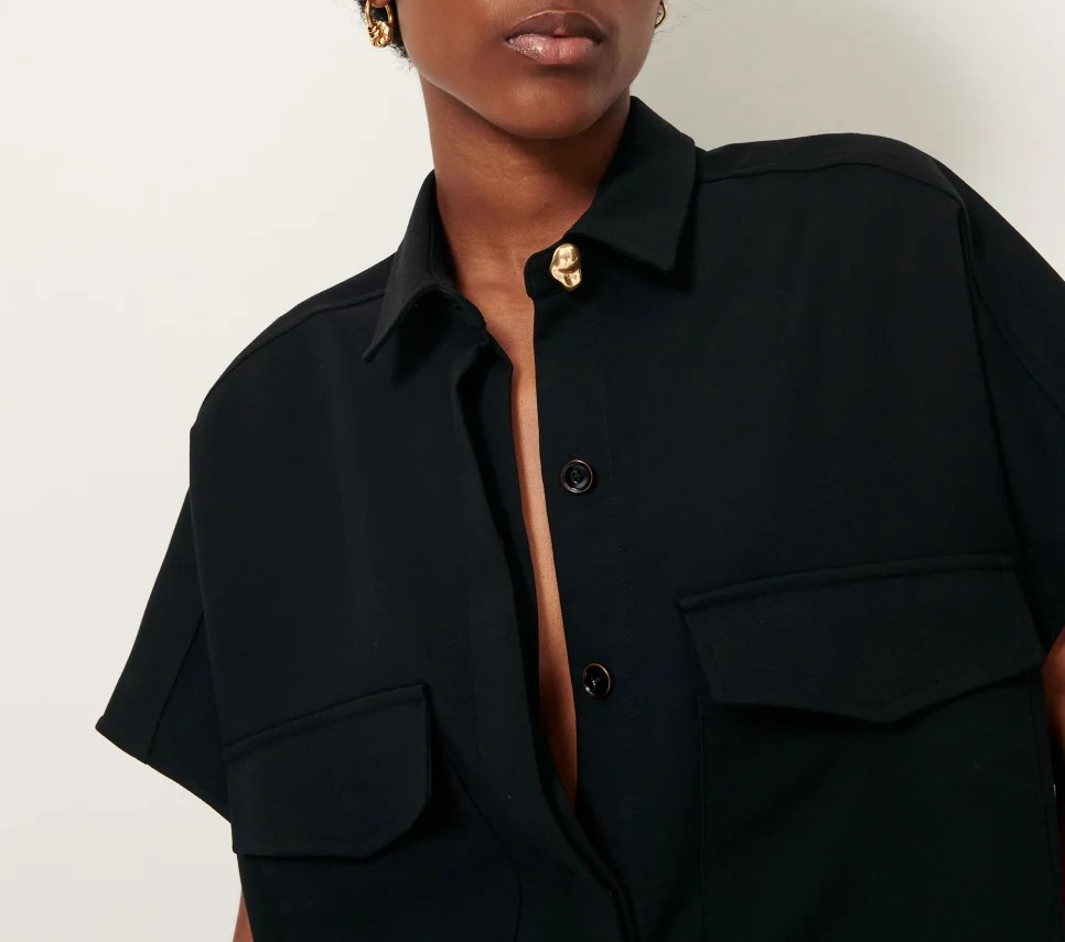 Cierre de botones que incluye un boton joya en el cuello, sisa baja, manga corta y bolsillos parche .