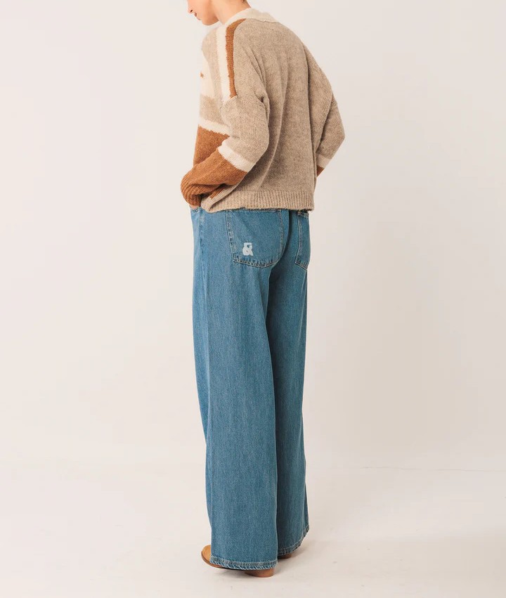Chaqueta con cuello pico, hombros caidos, manga larga , intarsia tricolor , tejido de punto gordo con alpaca y corte oversize
