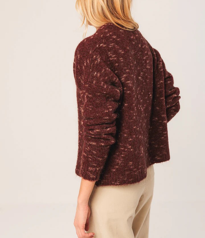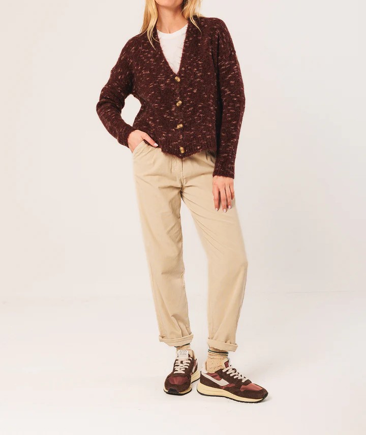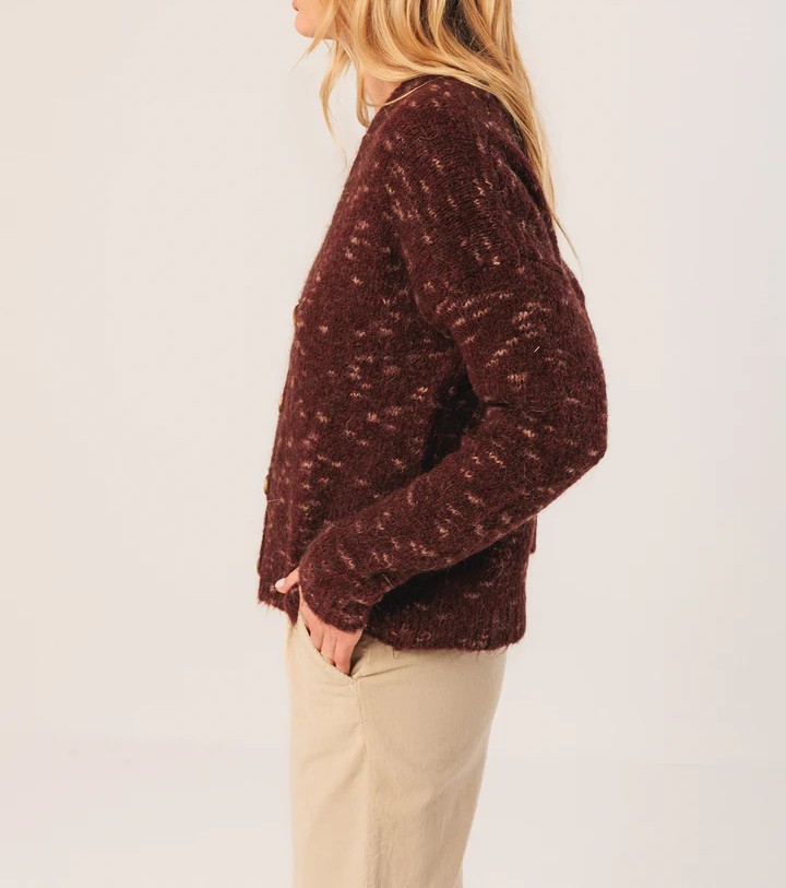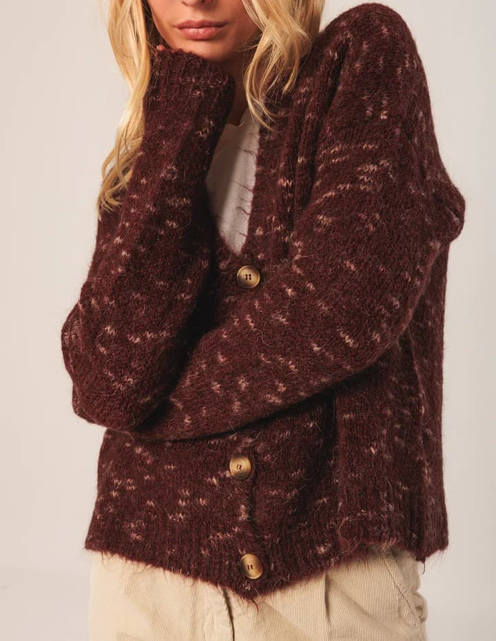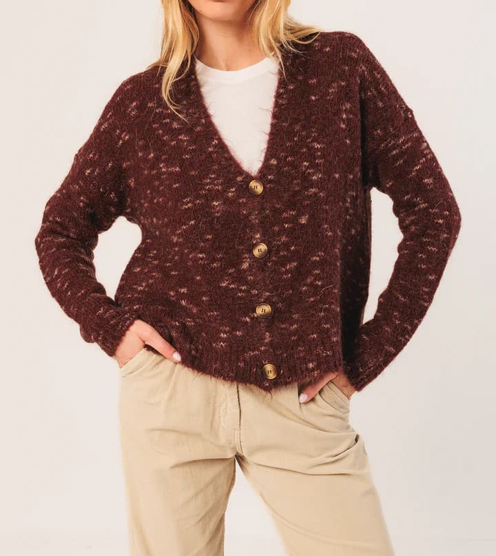 Cardigan relajado con hombro caido, manga larga y puño acanalado. Cierre de botones y un poco oversize.