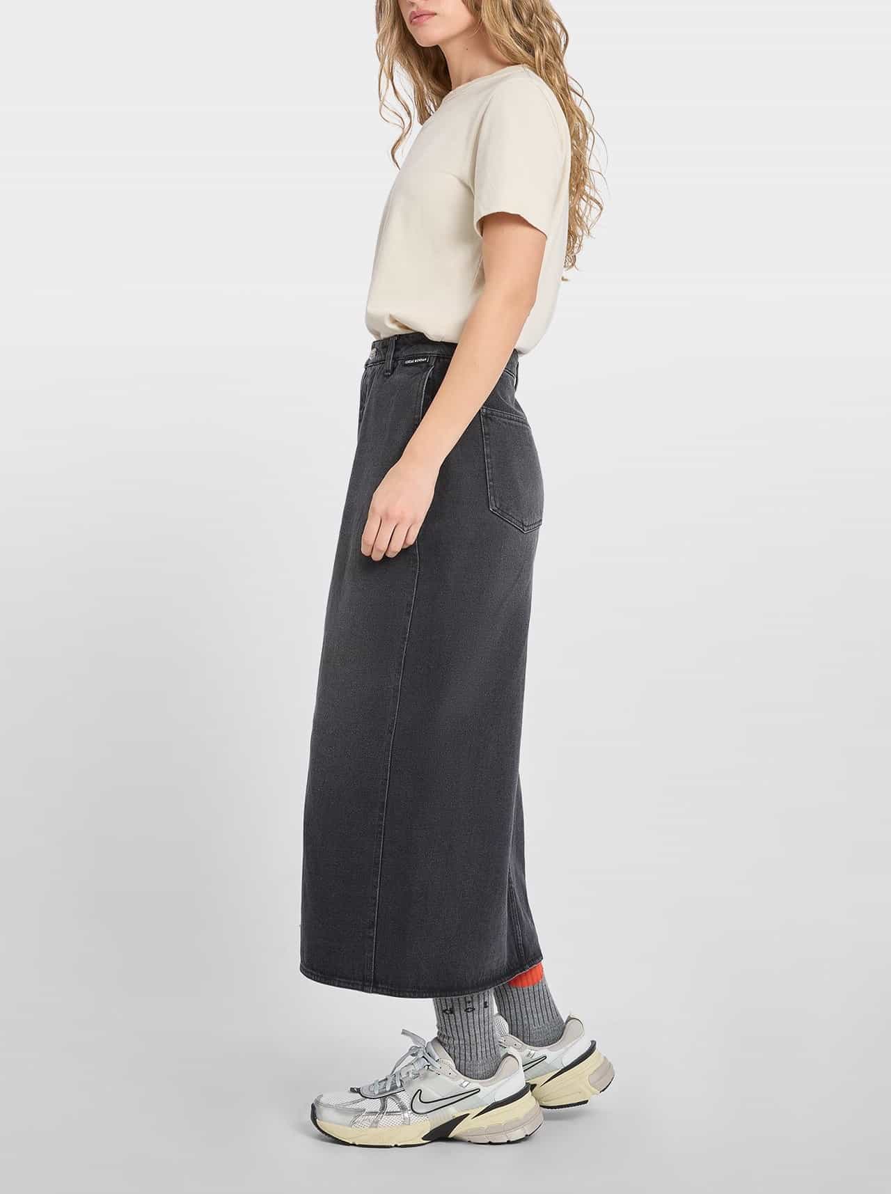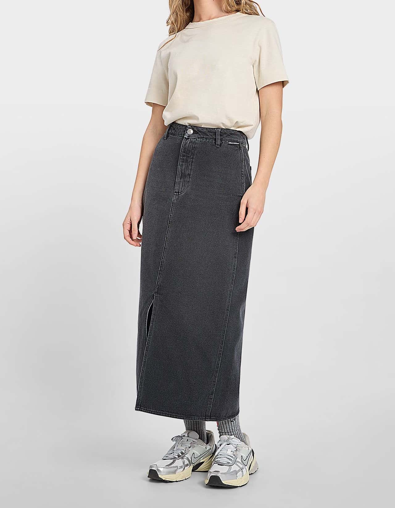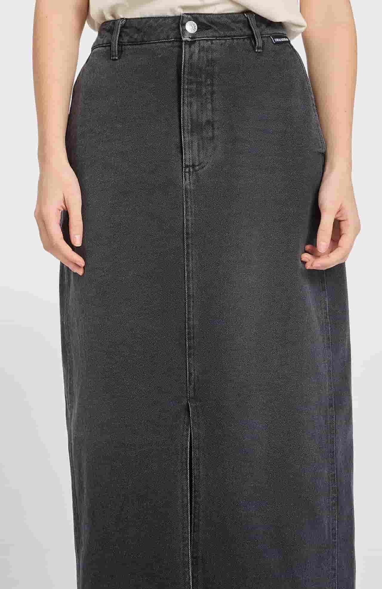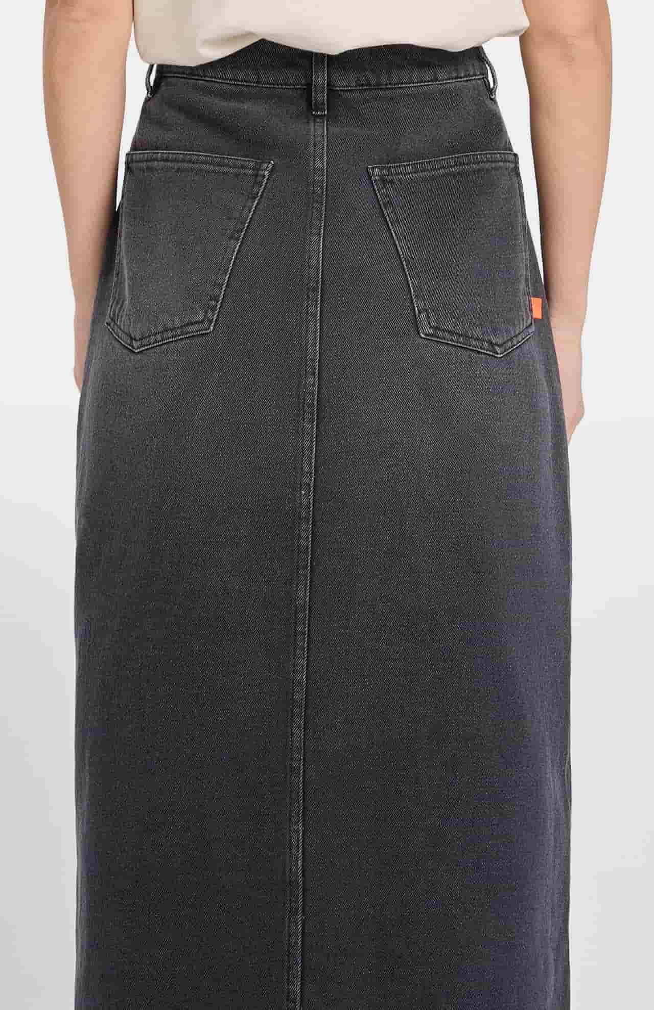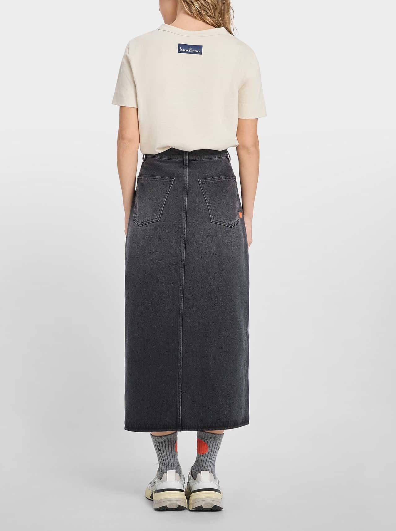 Falda midi denim excepcional, con abertura frontal en el bajo y cierre delantero con cremallera y boton.