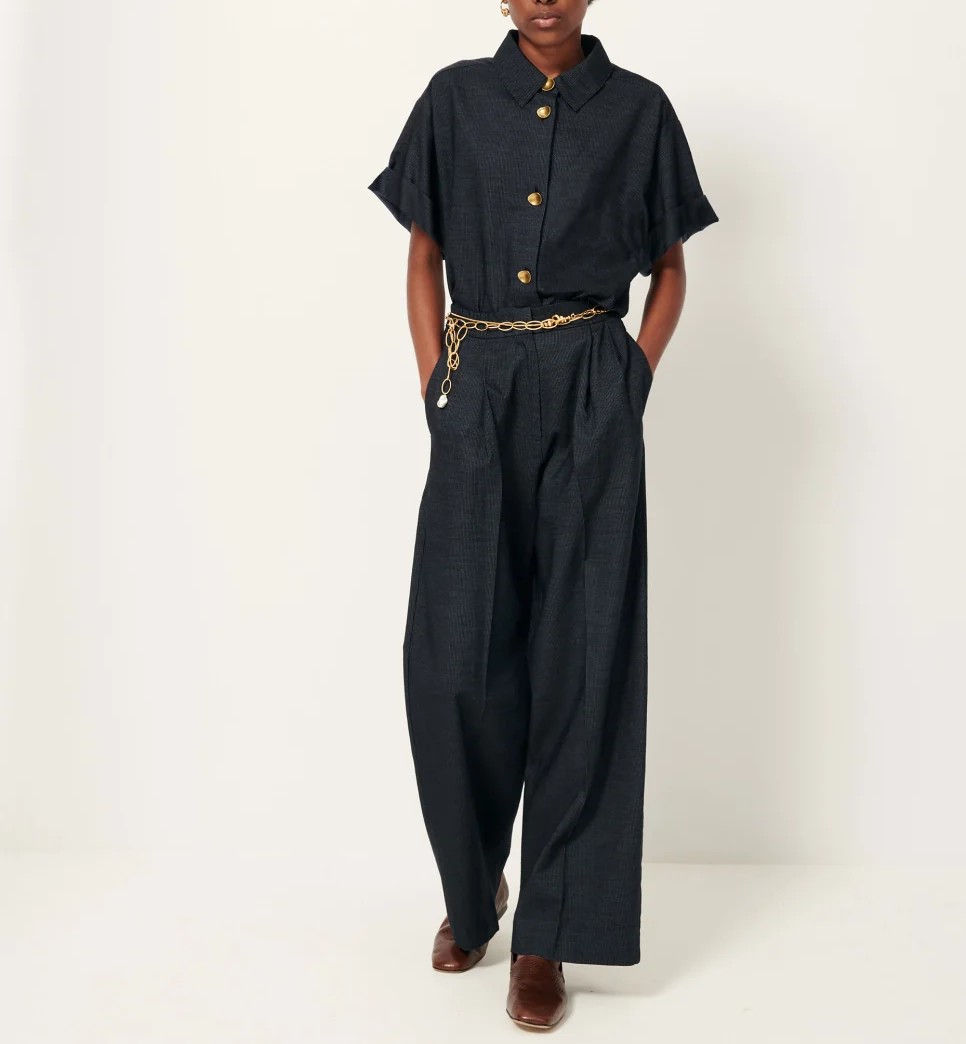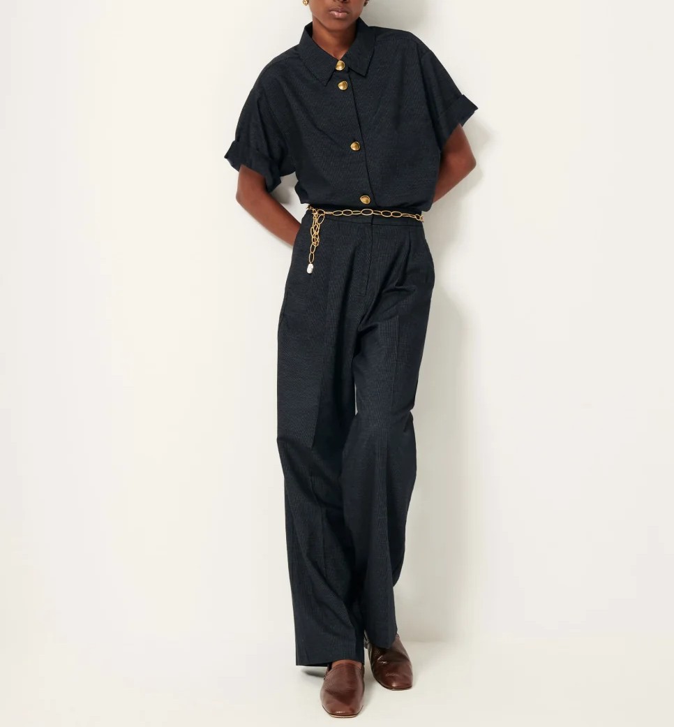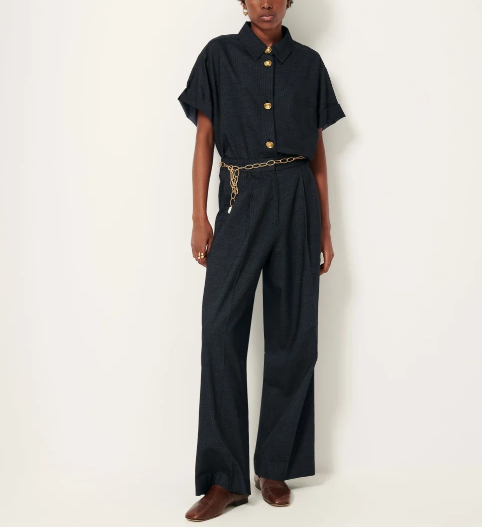 Talle alto elastico en la parte trasera, cierre de grapa y cremallera oculta.
