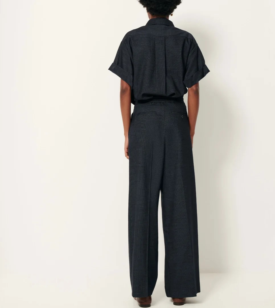 Pantalon de corte recto en tejido Oxford elastico con motivo de finas rayas bicolor.