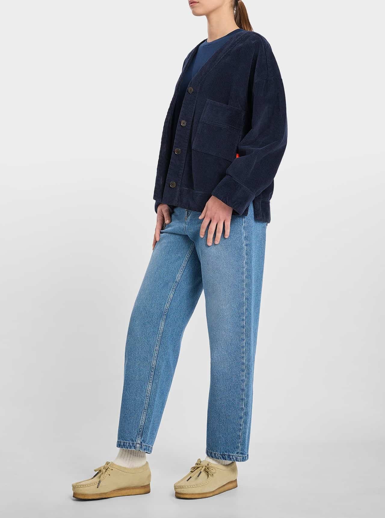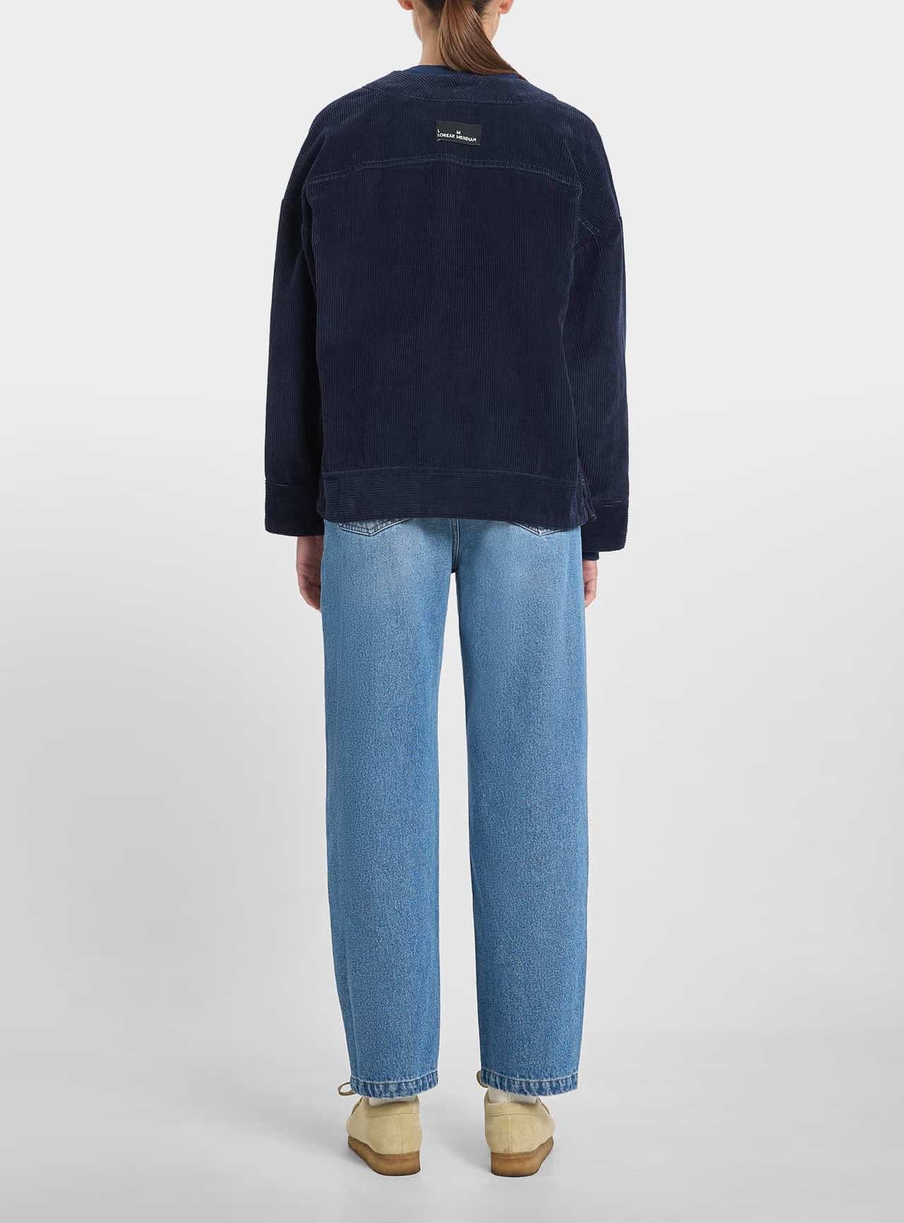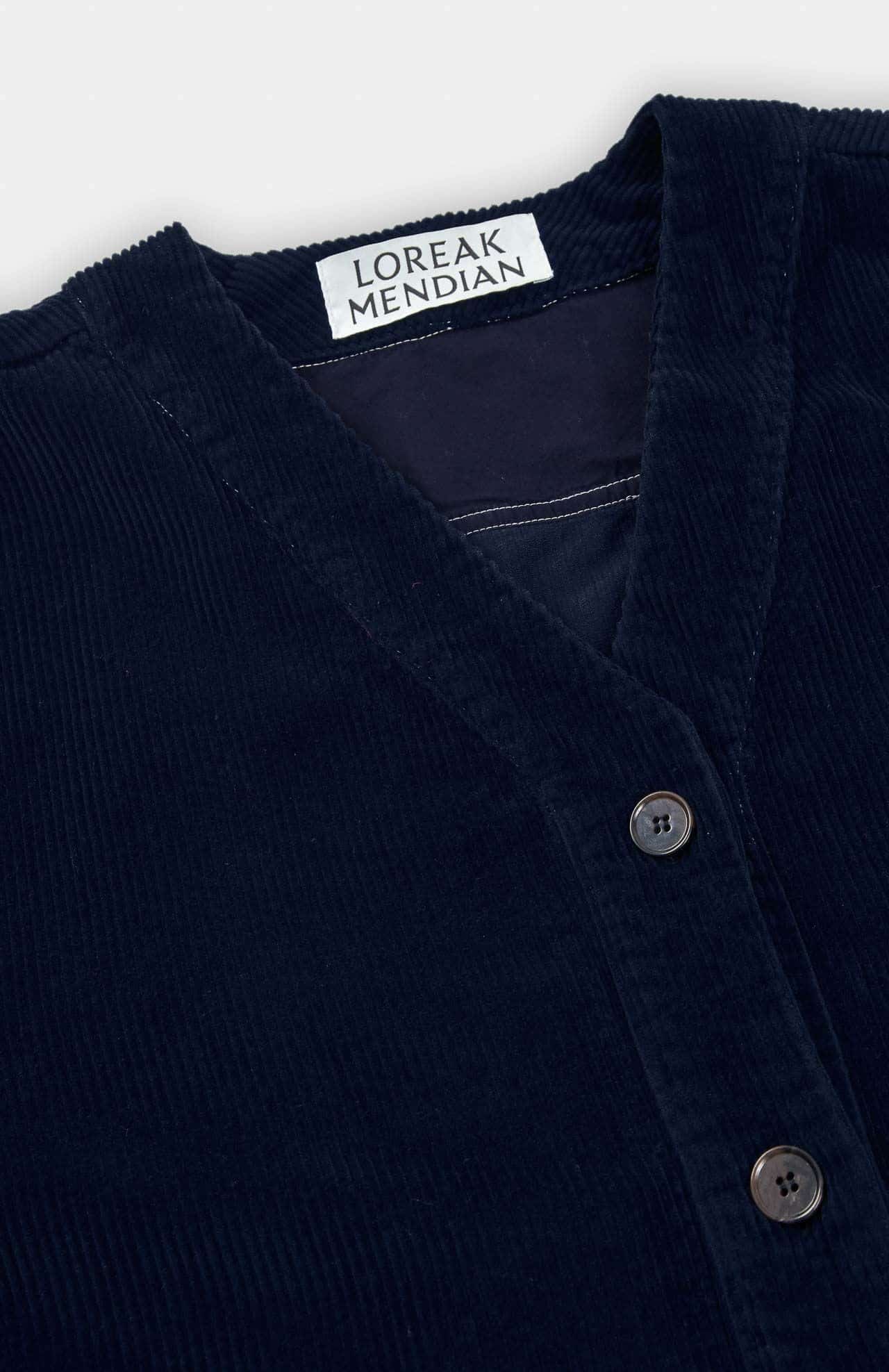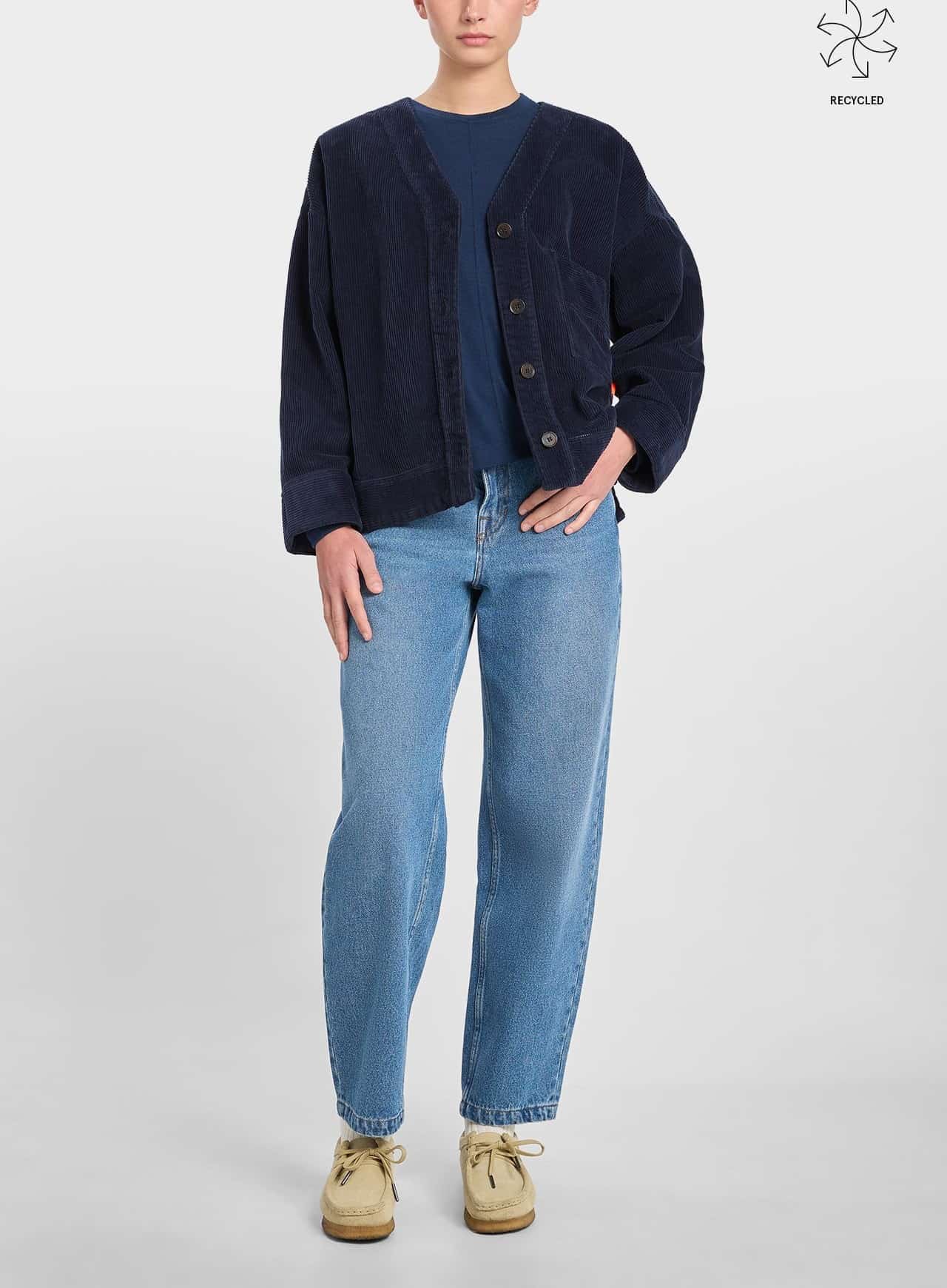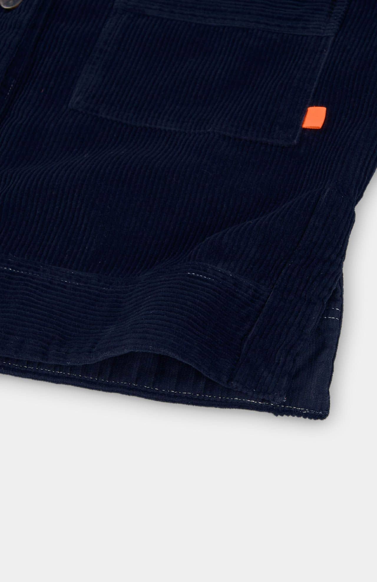 Sobrecamisa de pana, hecha de algodon reciclado , es ideal para un estilo relajado. Con hombros caidos y abertura laterales. Cierre de botones con cuello en V, bolsillos en el pecho y la cinta a contraste.