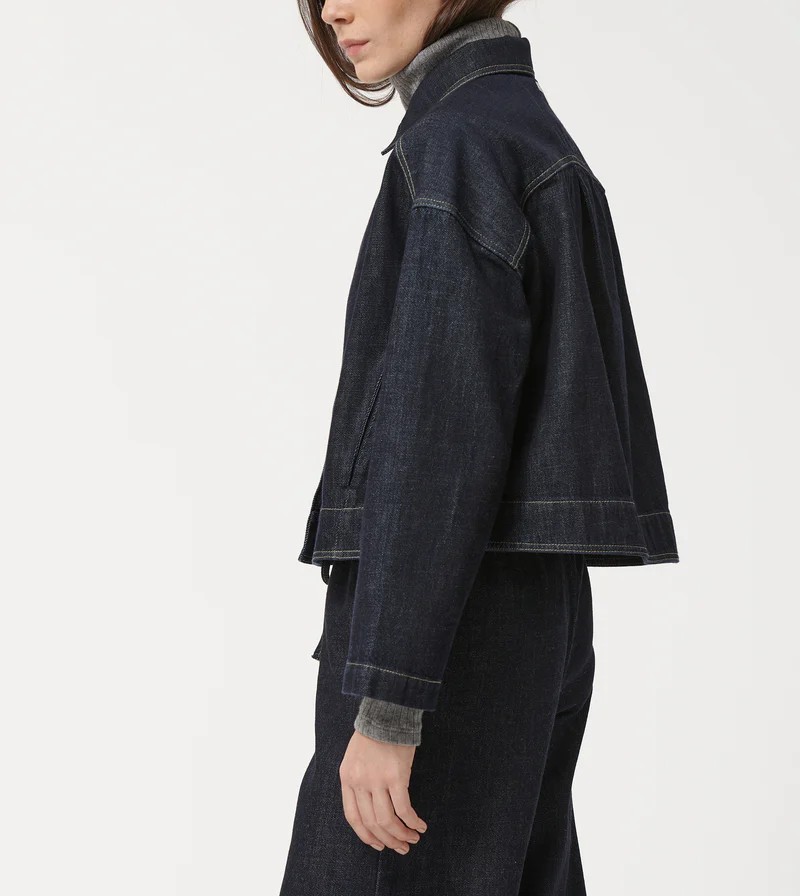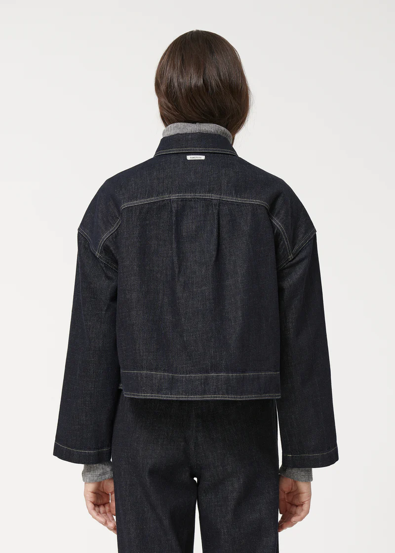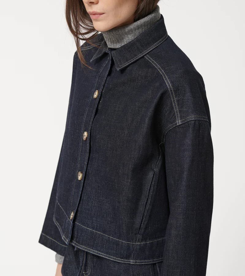 Chaqueta vaquera tipo bluson boxy en algodon, corte amplio, cuello de camisa clasica, abotonada en todo el frente, manga largas y amplias.