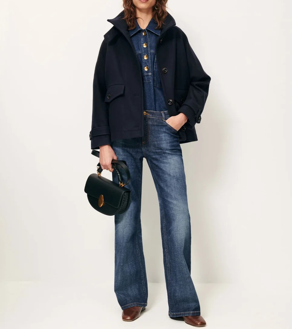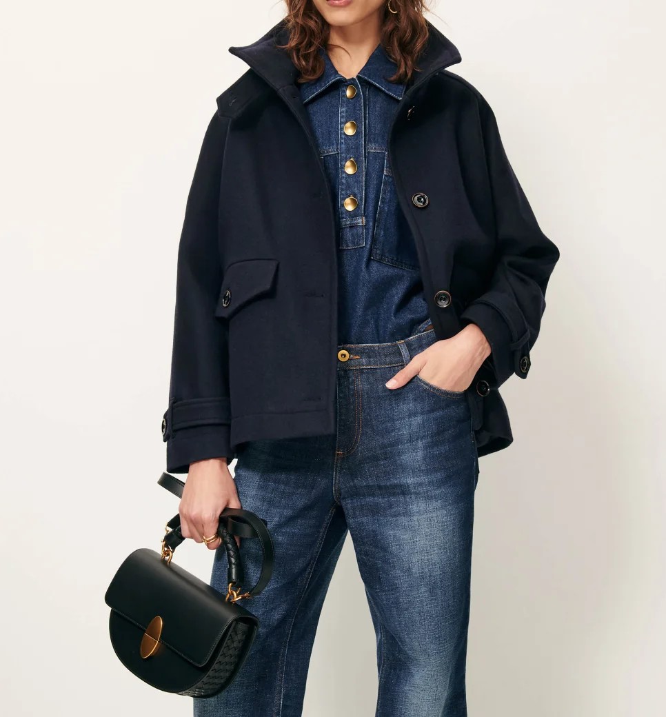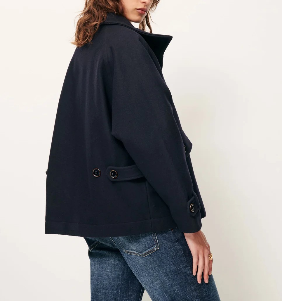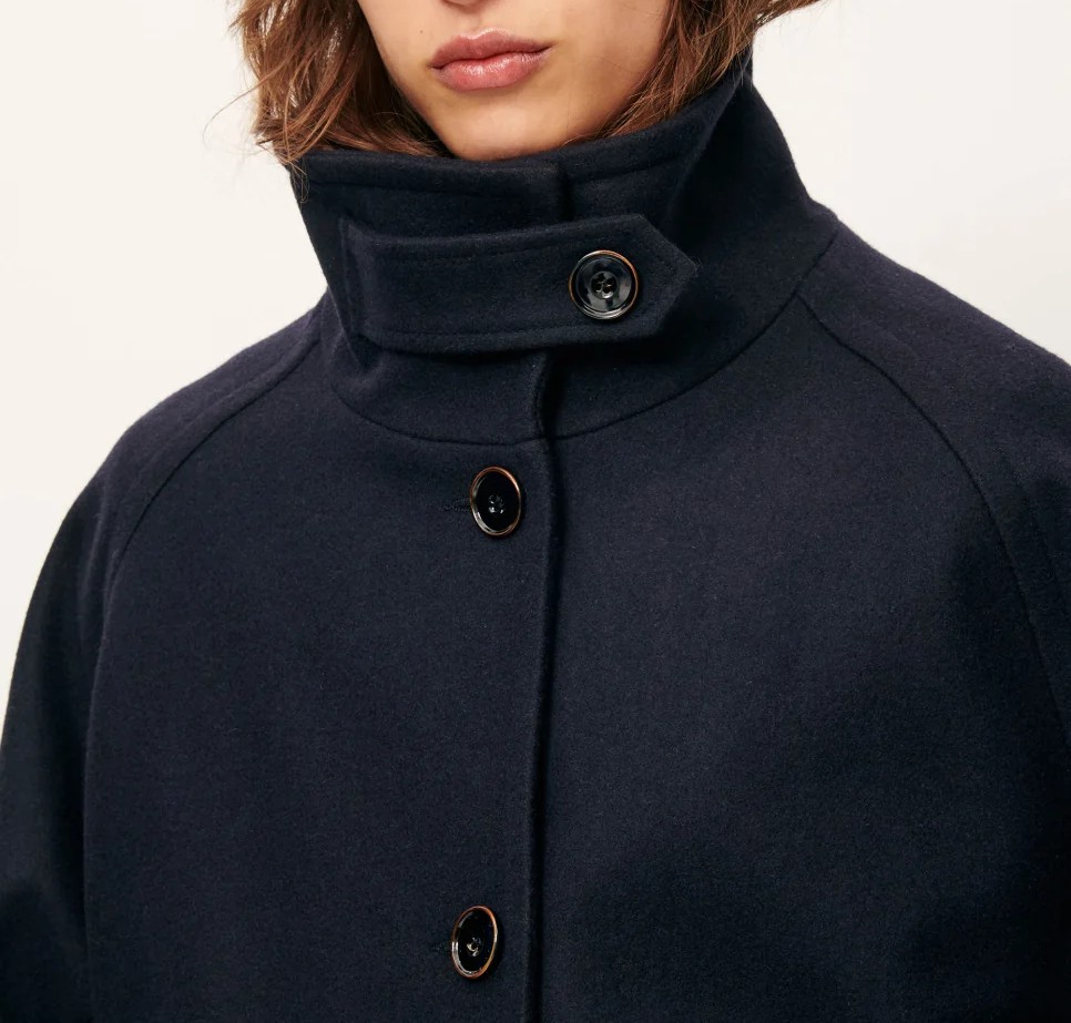Cuello alto con tapeta abotonada, cierre delantero con botones , bolsillos de ojal con solapa abotonada.