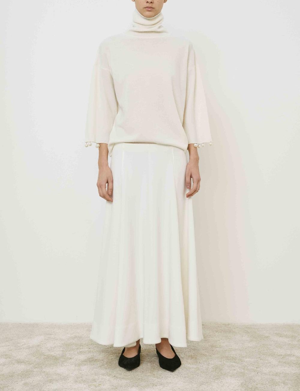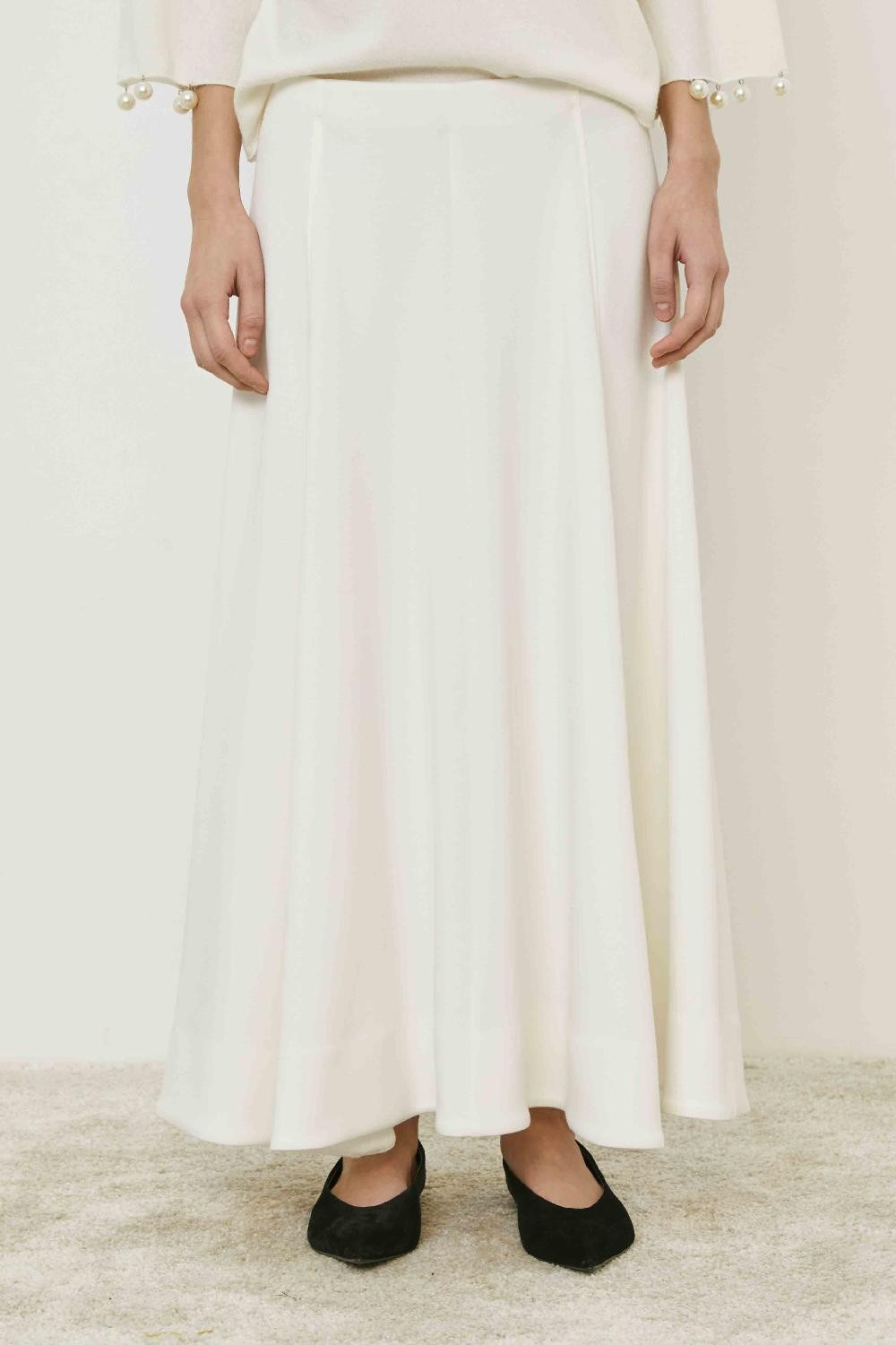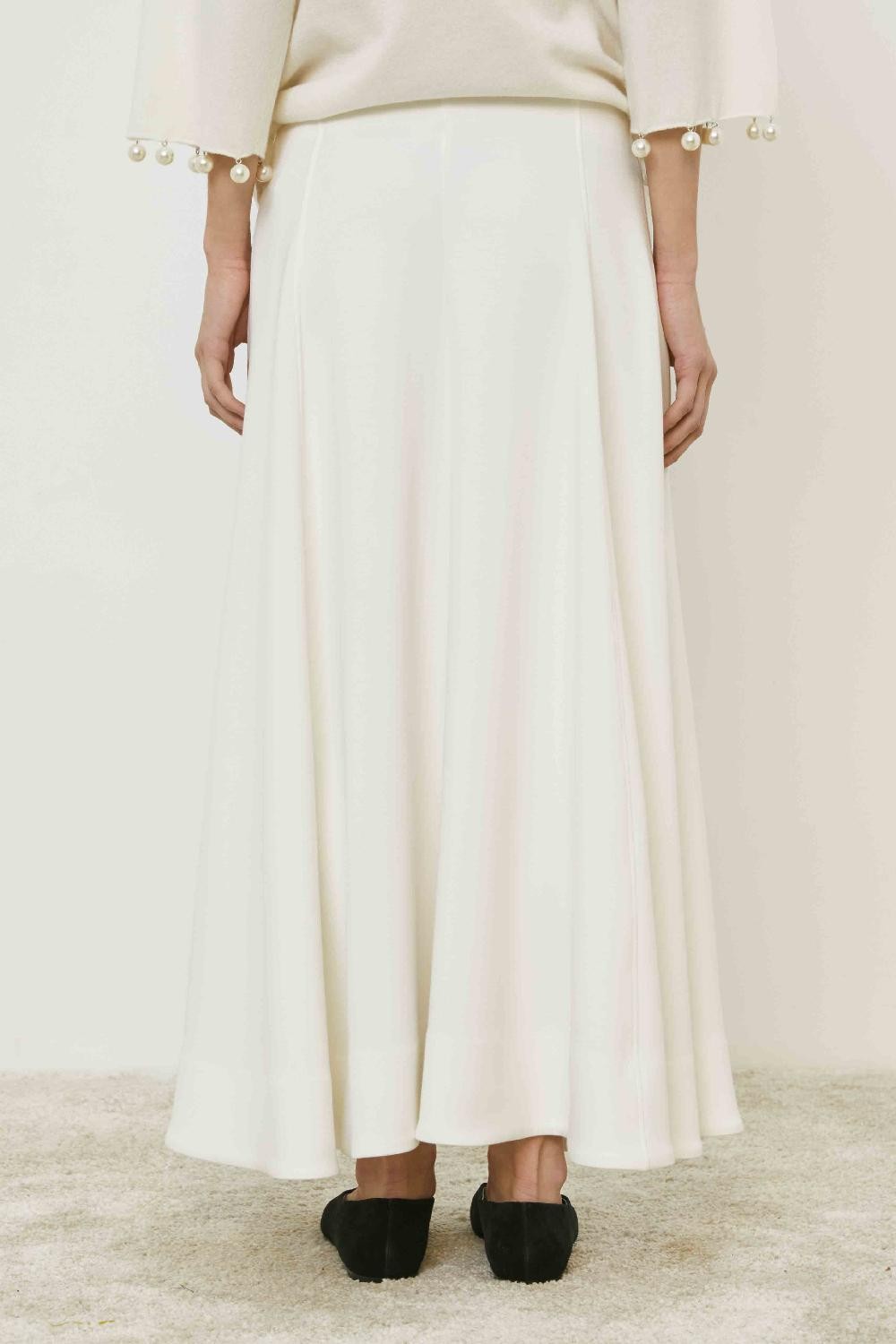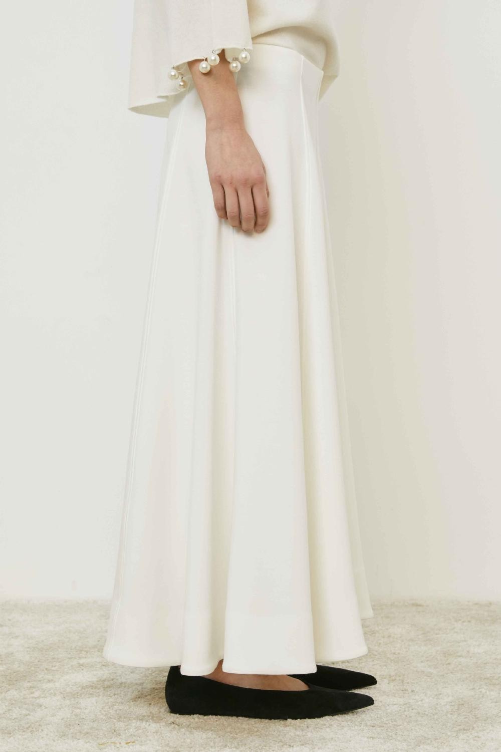 Falda con mucho volumen en una tela tipo punto roma, con cintura elastica y bastante alta.